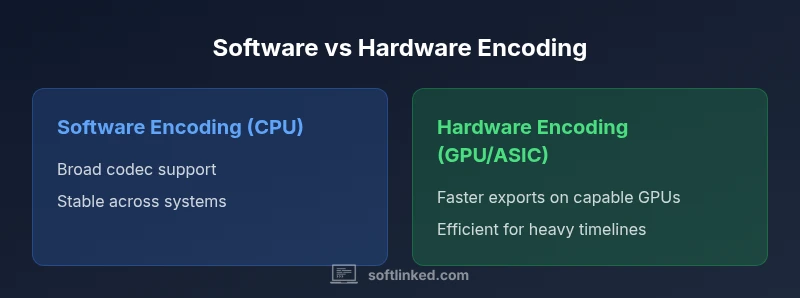 In Premiere Pro, the decision between software encoding premiere pro and hardware encoding hinges on where the encoding compute takes place: on the CPU or on a GPU/accelerator. Understanding this distinction is foundational for optimizing render times, color accuracy, and overall workflow reliability. The SoftLinked team notes that the right path is often context-dependent, shaped by project complexity, codec choices, and the hardware you own. In practical terms, software encoding prioritizes broad codec support, strict adherence to presets, and predictable behavior across workstations. Hardware encoding, by contrast, leverages GPU acceleration to speed up exports when the GPU is capable and drivers are stable. The takeaway is simple: neither path is universally best; the optimal choice depends on your typical project profile, the codecs you use most, and how critical export speed is to your deadlines. Keep this frame in mind as you compare options, test on representative footage, and document results for future projects.
