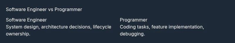 A software engineer designs and coordinates complex software systems, applying engineering principles to architecture, reliability, and maintainability. A programmer primarily writes code to implement features, though in practice many roles blend both tasks. The boundary varies by company and project size, with titles often used interchangeably. When evaluating roles, focus on the actual responsibilities, skills required, and the problems you’ll be solving rather than the label alone.