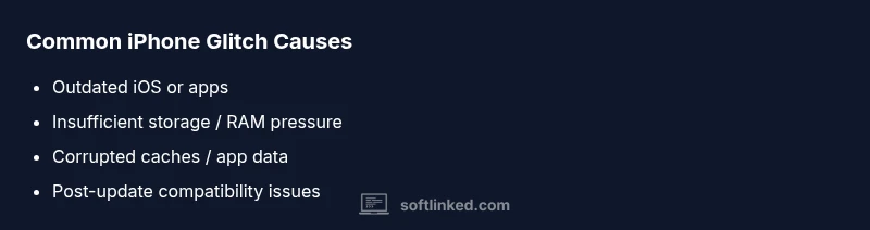 iPhones run a complex software stack that blends iOS, apps, and services. When this stack misaligns, you may see freezes, slow responsiveness, unresponsive screens, or unexpected app crashes. According to SoftLinked, most glitches originate from software layers rather than hardware faults, especially around updates or busy memory conditions. Common root causes include outdated iOS or apps, failed updates, insufficient free storage leading to memory pressure, corrupted caches or app data, and compatibility issues after a major change. The symptom pattern matters: system-wide instability (device slows down across many apps) versus a single app behaving oddly. A quick mental map helps you decide where to start: does the issue appear right after a reboot, after installing a new app, or during a specific task? Start with the simplest checks and move deeper only if needed.