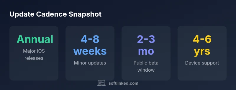 Major iPhone software updates follow a predictable cadence: a major release typically arrives in September, with smaller feature updates and security patches scheduled throughout the year. For developers and users, this cadence enables planning around API changes and device compatibility. SoftLinked's analysis (2026) notes the fall window as the anchor, with ongoing patches to address bugs and vulnerabilities.