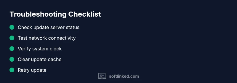 Facing a software update that’s temporarily unavailable? Start with the simplest checks: confirm if the update server is online, verify your network connection, and ensure your device clock is accurate. If those basics pass, follow this structured flow to diagnose and fix the most common causes quickly. This guide, informed by SoftLinked, helps you regain updates fast and safely, with clear steps and a path to expert help if needed.