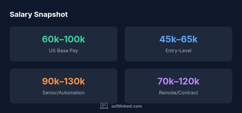 Entry-level testers typically start at the lower end of the US range, often near $40k–$60k, depending on city and company. Growth comes with hands-on experience and certs.