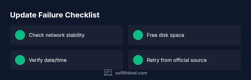 Before diving into deep fixes, run through fast checks that catch the majority of failures. Ensure the device is connected to a stable network (prefer wired or a strong Wi‑Fi signal). Verify there’s enough free disk space for the update package and temporary working files. Check the device’s date and time settings, as discrepancies can cause certificate or server validation failures. Look for any pending restarts or pending system maintenance reminders. If the update is from a corporate or enterprise source, confirm the update channel and policy settings aren’t blocking the install. Finally, review any error messages or codes and search for their meaning in official documentation or SoftLinked’s troubleshooting notes.