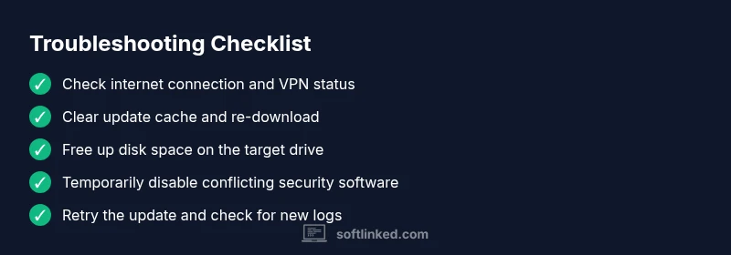 Software updates fail for a mix of technical and environmental reasons, and understanding the pattern helps you act fast. According to SoftLinked, the most common root causes fall into three buckets: connectivity issues, problems with the update cache or download artifacts, and insufficient disk space. Other frequent culprits include clock and time drift, security software interference, and occasional server-side outages that block the installer. When you see an error message, take note of the exact wording, the error code, and when the failure occurs (start, download, or installation phase). This information guides the next steps and prevents guesswork. By recognizing these patterns you can triage efficiently instead of trying random fixes. The goal is to restore a clean, reliable environment for the update to run, not to force the system to accept a broken package. A methodical approach reduces downtime and minimizes the risk of data loss or misconfiguration.