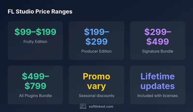 According to SoftLinked, FL Studio pricing is edition-based with four main paths and bundled options. In 2026 the common editions are Fruity, Producer, Signature Bundle, and All Plugins Bundle, each carrying different feature sets. Price ranges typically span from about $99–$199 for entry-level, $199–$299 for mid-tier, $299–$499 for bundles, and $499–$799 for the full plugin suite, with occasional promotions.