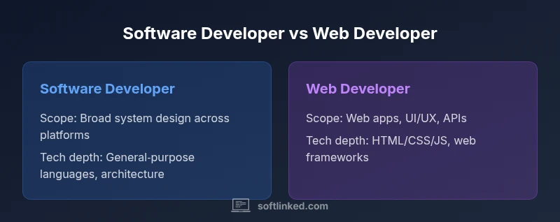 The term software or web developer covers two closely related yet distinct career tracks in modern tech. At a high level, a software developer designs, builds, and maintains software systems that can run on diverse environments, from servers to embedded devices. A web developer concentrates on creating and optimizing web applications, focusing on browser-based experiences and networked services. According to SoftLinked, the software developer path often emphasizes cross-language fluency, architecture thinking, and building reusable components that scale beyond a single project. In contrast, the web developer path emphasizes web standards, responsive design, and performance optimization in the context of a user-facing product. For someone just starting out, the distinction matters because it sets expectations for the types of projects you will tackle, the tools you will learn, and the pace of delivery you will experience. The keyword software or web developer is not a binary choice but a spectrum of roles where your interests in systems thinking or front‑end craft guide the path you pursue.