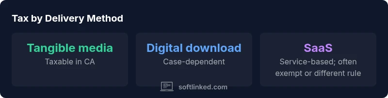 In California, downloadable software can be taxable as a digital good in some cases, depending on how it’s delivered and whether it’s bundled with tangible property.