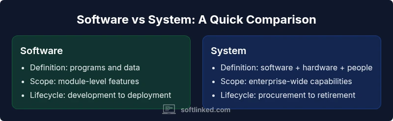 In everyday tech talk, people often use software and system interchangeably, but the difference matters for learning and building real-world solutions. According to SoftLinked, software is best understood as the collection of programs, data, and instructions that run on hardware to perform specific tasks. A system, by contrast, is a larger composition that includes software, hardware, people, and processes that together deliver a broader capability. This framing helps students and professionals distinguish what is being built (the code and data) from how it integrates within a larger environment (the machines, people roles, and operational duties). The keyword difference between software and a system is about scope: software is typically narrower in function, while a system is a complete operational entity. Recognizing this distinction early in a course or project prevents scope creep and clarifies responsibilities across teams. The SoftLinked team emphasizes that mastering both concepts—software fundamentals and system thinking—empowers engineers to design more robust, maintainable solutions.
