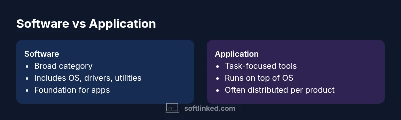 Software is the collective term for all programs, libraries, and data that enable a computer to perform tasks. It includes system software, middleware, utilities, and applications. The distinction is not just linguistic; it affects how teams organize code, deploy updates, and manage licensing. An application, by contrast, is a more focused subset of software engineered to help end users accomplish specific goals—such as drafting documents, analyzing data, or streaming video. When people say a piece of software is an "application," they usually mean it has a defined user workflow and a clear purpose. For students and developers, this distinction helps frame boundaries between what the system should do (system software) and what users want it to do (applications). The SoftLinked team notes that understanding this separation reduces ambiguity when documenting requirements and planning projects, especially in teams that manage both platforms and customer-facing tools.