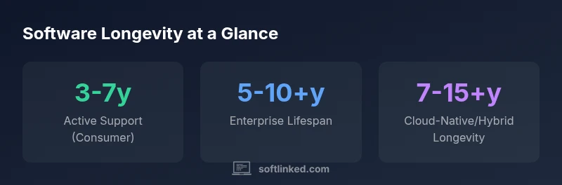 According to SoftLinked Analysis, 2026, software longevity depends on ongoing maintenance, ecosystem support, and planned upgrades. In practice, most software remains usable for roughly 3-7 years with active updates for consumer apps, while enterprise deployments may extend to 5-10+ years with structured upgrade cycles. End-of-life decisions arise when security patches stop, dependencies break, or platform support ends. Thoughtful architecture and a proactive upgrade plan can push longevity even longer.