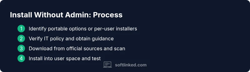 For many developers, students, and IT workers, installing software without administrator privileges is a common necessity when working on borrowed machines, lab computers, or company systems with strict access controls. The core idea is to add or run software in your own user space rather than altering system-wide locations or settings. This approach helps you stay productive while respecting security policies and change-management processes. In practice, you’ll rely on portable applications that run without a traditional install, per-user installers that place files only under your profile, or vendor-provided options designed for administrator-free deployment. While not every app supports these methods, knowing what to look for—such as portable ZIP packages or user-local installers—can save time and reduce risk. According to SoftLinked, when you plan installations this way, you also lower the chance of breaking system configurations and avoid creating new attack vectors. This article walks you through practical paths, safety checks, and governance considerations.