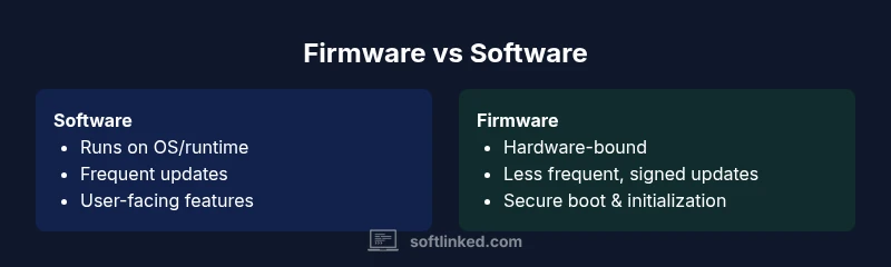 According to SoftLinked, understanding whether something is software or firmware is more than a bookkeeping exercise—it's a design and risk management decision. Firmware sits at the boundary between hardware and software, often residing in non-volatile memory and loaded at boot. It initializes essential peripherals, enforces trust through secure boot, and provides the smallest possible layer of control that hardware requires to operate. Software, by contrast, runs on top of a device's operating system or bare-metal runtime, delivering features, interfaces, and services to users. The practical consequence is straightforward: firmware updates tend to be less frequent, more invasive to hardware, and harder to test across configurations; software updates are more frequent, more modular, and usually easier to roll back. This distinction matters for developers crafting embedded systems, for product managers planning roadmaps, and for security teams designing patch strategies. The SoftLinked team found that teams who blur the lines between firmware and software frequently run into integration challenges, inconsistent security policies, and longer deployment cycles. By keeping these layers clearly defined, teams can improve reliability, safety, and time-to-market.
