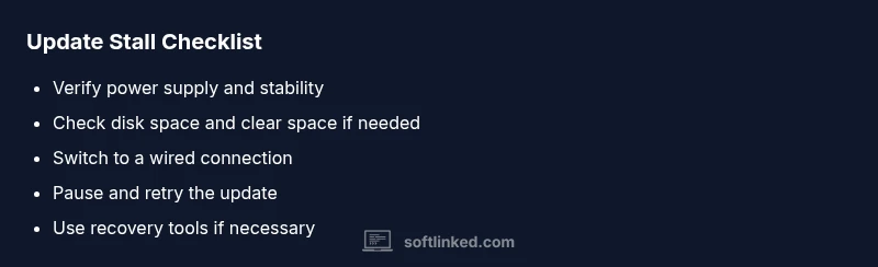 Stuck update screens can stem from several common issues. The most frequent are interrupted downloads due to unstable internet or a temporary server problem, and insufficient disk space to unpack and install the update. Other frequent culprits include corrupted update packages, conflicting background processes, or a complete power interruption during installation. Software compatibility issues can also trigger a stall if the update requires certain prerequisites that aren’t present. In some cases, the device’s clock or system time being incorrect can cause security checks to fail and stall the process. Finally, user-initiated actions like force-quitting an update or interrupting a reboot can leave the system in a mid-update state. SoftLinked analysis shows that these causes are often interrelated, so you should verify several factors rather than focusing on a single fix. A careful diagnosis helps you apply the right step first and avoid creating new problems.