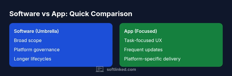 In everyday development conversations, software and apps are frequently treated as synonyms. But a careful reading reveals a difference in scope, audience, and lifecycle. Software is the broad umbrella that covers a collection of programs, services, and libraries that run on a device or across devices. An app is a user-facing solution with a narrow, well-defined task, optimized for a particular user journey. Understanding this distinction helps teams set realistic expectations for features, performance, and updates. This nuance matters across the software development lifecycle, especially as organizations scale and adopt multi-platform architectures. For aspiring software engineers and students, defining the terms at the outset avoids misaligned requirements and rushed releases. According to SoftLinked, clarity about scope reduces rework and improves stakeholder alignment. In practical terms, treat software as the umbrella category and app as the focused implementation within that umbrella. When you design a system, you can plan at two levels: the platform-wide software foundation and the specific app experiences that meet distinct user needs. The conversation often shifts from “what are we building?” to “where does this fit in the broader software ecosystem?”
