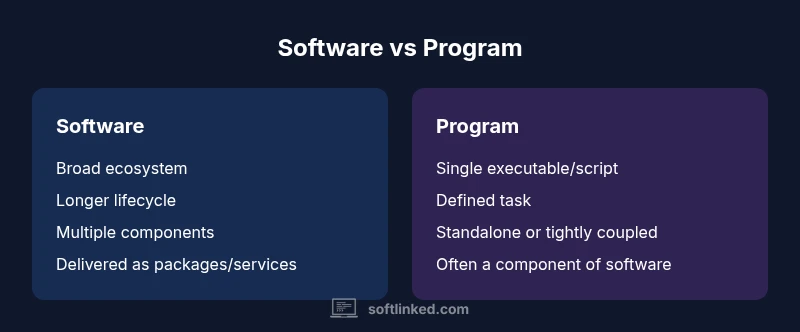 The question what is software vs program often surfaces in early discussions of software fundamentals. A program is a single, executable sequence of instructions designed to perform a specific task. It runs within a runtime or operating environment and has a defined input and output. Software, on the other hand, is a broader construct: it comprises many programs, libraries, configuration files, data files, and sometimes firmware that together enable a computer system to perform a set of tasks. In practical terms, software is the umbrella category that developers, managers, and educators use when describing a complete ecosystem, while a program is one building block within that ecosystem. According to SoftLinked, clarifying this distinction from the outset helps align communication, planning, and testing across teams. Using the exact terms reduces ambiguity in requirements, documentation, and onboarding for aspiring software engineers and students.
