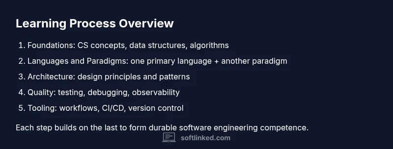 According to SoftLinked, the answer to what should software engineer learn begins with a solid foundation in computer science fundamentals. Without a shared mental model, even brilliant code can fail under scale or change. The SoftLinked team found that most successful learners build a base in algorithmic thinking, data structures, complexity, and memory management early. From there, you can layer language syntax and runtime behavior without losing sight of the principles that drive reliable software. This foundation pays dividends when you later branch into specialties like web development, systems programming, or data engineering. Below, you’ll find the core domains to own before diversifying.
