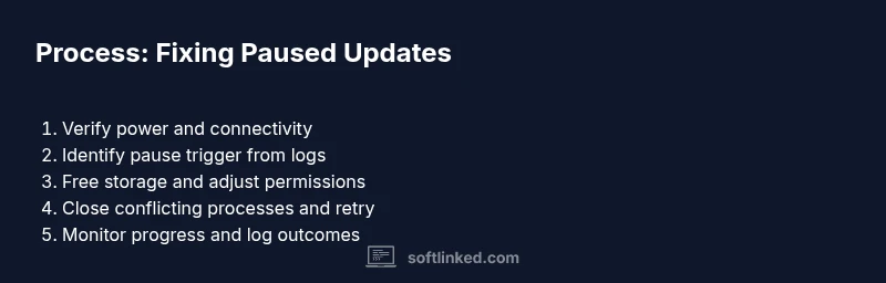 When a software update pauses, it often signals an underlying issue rather than a simple hiccup. Pauses can occur due to unstable network connections, inadequate storage, power-saving policies, or conflicting applications that lock resources during the install. In practice, understanding the exact trigger is essential because a blind retry can worsen corruption or leave the device in an inconsistent state. If you are wondering what to do if software update is paused, this section lays the groundwork for diagnosing the pause without risking data loss or longer downtime. According to SoftLinked, the most reliable approach is to treat the pause as a diagnostic signal rather than a failure to complete. Start with one or two verifiable checks, then proceed to targeted remediation. The goal is to restore a safe, bounded environment so that the update can proceed without surprises. Recognize that updates often execute in stages: downloading, validating, installing, and finalizing. A pause at any stage may require different remedies, but the core principle remains the same: stabilize, verify prerequisites, and retry with incremental safeguards. This mindset helps developers and IT professionals prevent cascading failures across devices or fleets.