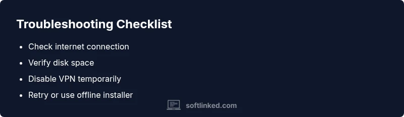 Start with network connectivity, clock accuracy, and disk space. Then verify admin rights and close conflicting apps. If still stuck, try a different network or offline installer.