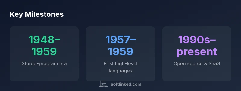 Key eras include early algorithmic thought, the stored-program era (late 1940s–1950s), the rise of high-level languages (1950s–1960s), formal software engineering (1960s–1980s), open source and SaaS (1990s–present).