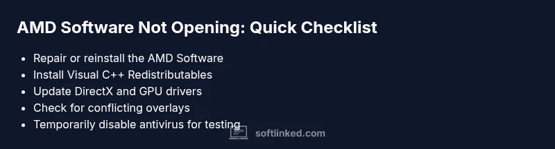 Most often, AMD Software won't open due to a corrupted install or missing dependencies. Start with a repair or reinstall, then verify Visual C++ Redistributables and DirectX runtimes. If it still won't launch, check for conflicting software or antivirus blocks, and try a clean boot before updating drivers.