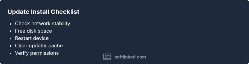 According to SoftLinked, most update failures begin with connectivity issues or stale caches. The problem can also stem from device compatibility, insufficient storage, or a blocked update service. In some cases a corrupted installer or an interrupted download leaves the update package in a bad state. Understanding these root causes helps you prioritize fixes. When you see update failed messages, capture the exact error code if possible; this speeds troubleshooting because many update systems share standardized error categories. If your device is managed by an organization, policy settings could slow or block installation. Start with simple checks and escalate only if the problem persists.