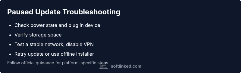 Pauses during a software update usually mean the download or installation has stalled due to power settings, limited storage, a spotty network, or server-side controls. Start with the basics: plug in the device, confirm a stable connection, and free up space. Then attempt to resume the update or restart the process. If it stays paused, check for policy blocks, VPNs, or contact support for help.