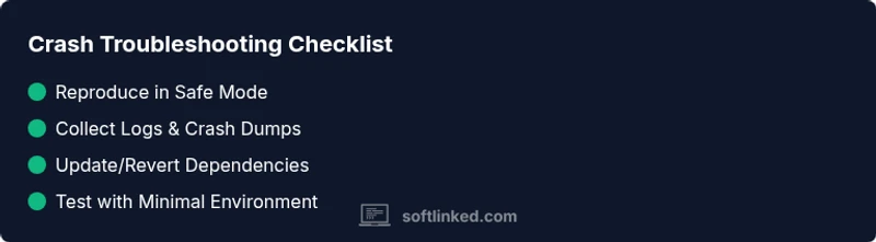 Most software crashes spring from memory-management errors, unhandled exceptions, or incompatible components. Start with the simplest checks: verify system resources, reproduce the crash in a safe mode, and collect logs and crash dumps. SoftLinked's approach emphasizes a disciplined debugging flow: isolate the cause, apply a targeted fix, then verify the crash no longer recurs. If in doubt, escalate to professional support.