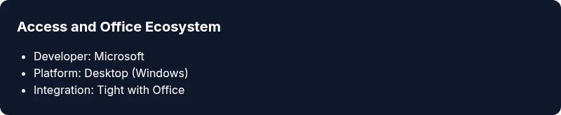 | Product focus | Desktop relational database | Part of Office ecosystem |